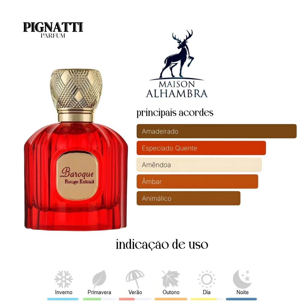 Baroque Rouge Extrait de Maison Alhambra é um perfume Aromático Especiado Compartilhável. Baroque Rouge Extrait foi lançada em 2022. As notas de topo são: Açafrão e Amêndoa. As notas de coração são: Notas Amadeiradas, Cedro e Jasmim Egípcio. As notas de fundo são: Notas Amadeiradas, Âmbar Cinzento e Almíscar.